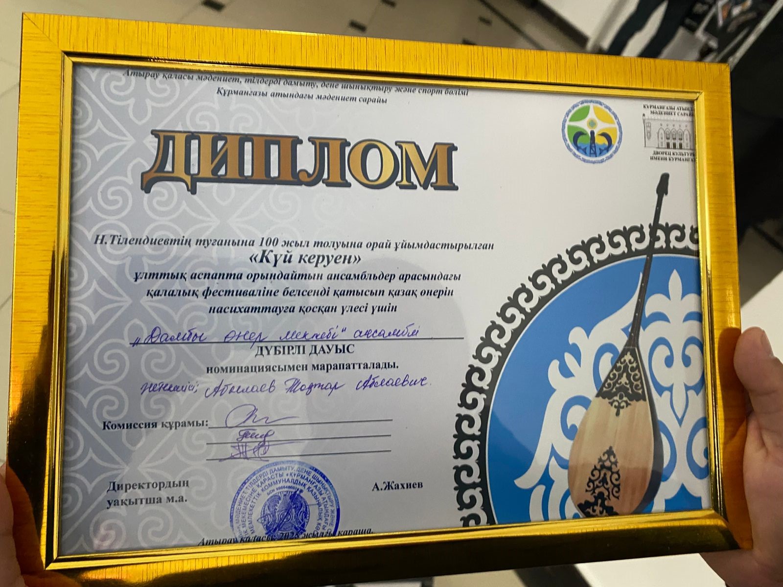 Н.Тілендиевтің туғанына 100 жыл толуына орай ұйымдастырылған «Күй керуен» ұлттық аспапта орындайтын ансамбльдер арасындағы қалалық фестиваліне белсенді қатысып қазақ өнерін насихаттауға қосқан үдесі үшін «Дүбірлі дауыс» номинациясымен марапатталды.